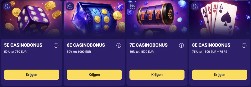 - 3e storting – De laatste stortingsbonus van het welkomstpakket geeft je een bonustegoed van 75% van je derde storting tot een maximum van €500 en 70 gratis spins.